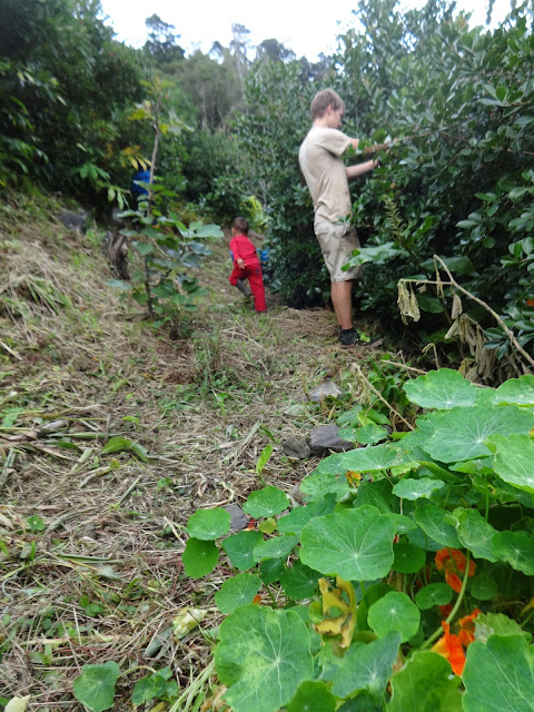 The food has gone wild here, with figs, ground cherries, taro, peppers, citrus, comfrey, peanuts and coffee thriving in the sun together.