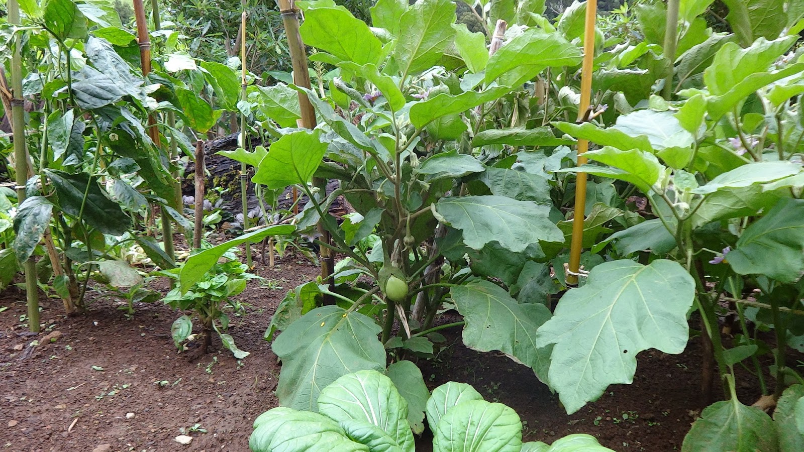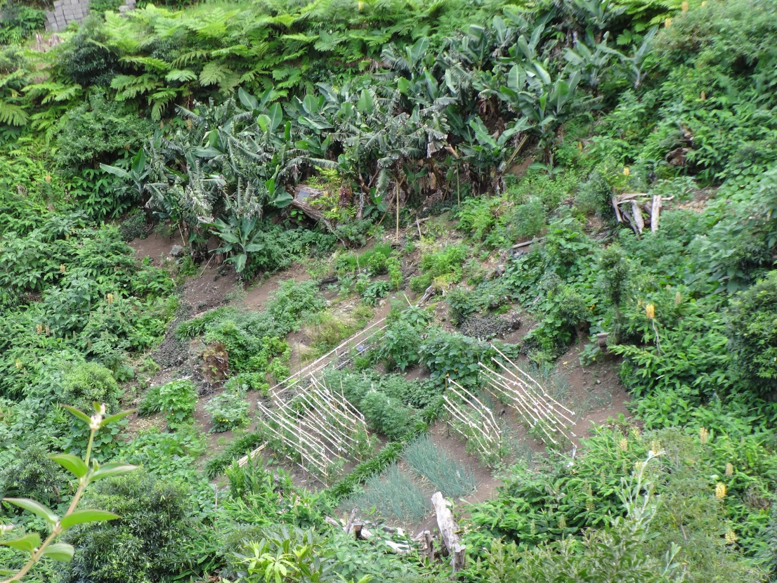 A closer look reveals tomatoes, beans, onions, squash, sweet potatoes and herbs thriving in the rich jungle valley.