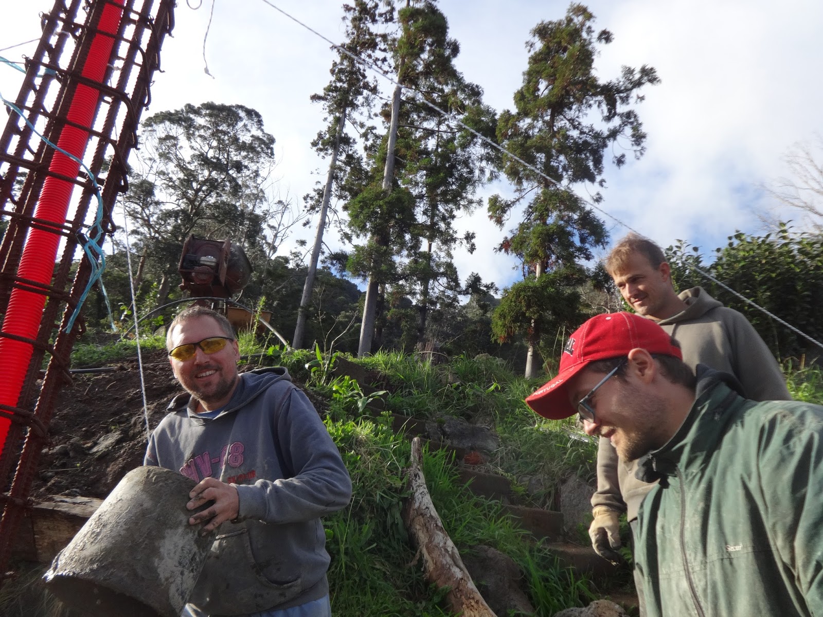 The iron is held in place with guide ropes to maintain perfect North-South and Vertical alignment as the concrete is dumped bucket-by-bucket into the wooden forms.