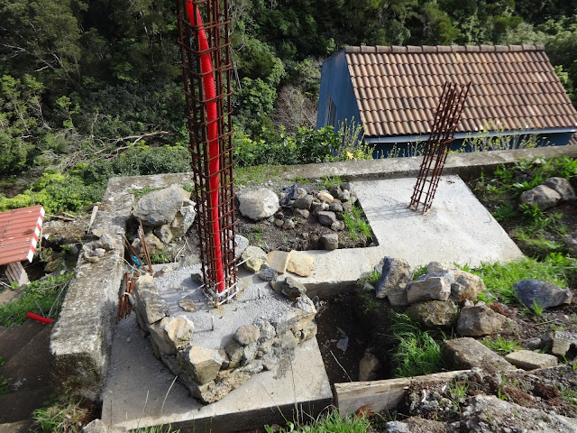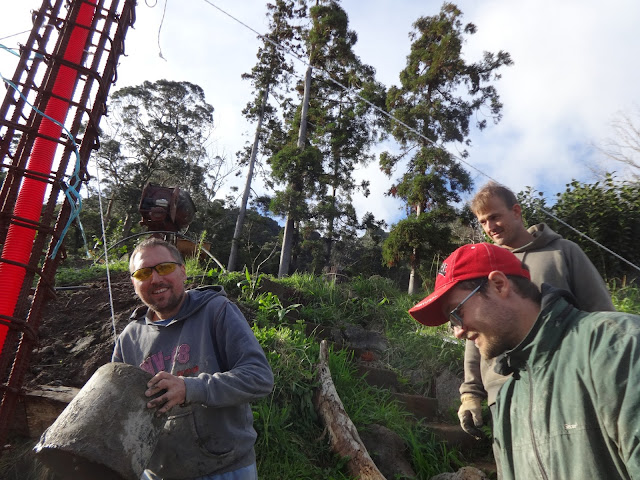 Once at the top of the hill, the bags are sent down a steel cable to the location of the work site. In the photo above you can see the bags of materials in cue to be launched on the steel cable directly above them.